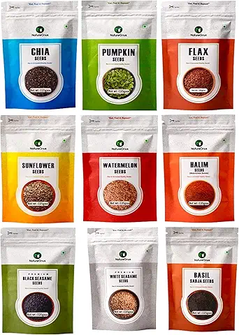 NatureOnus All Raw Seeds Combo Pack of 9-1125g | Chia, Pumpkin, Sunflower, Flax, Watermelon, Halim, White Sesame, Black Sesame & Basil Seeds 125g Each | Seeds Mix Superfoods for Eating Combo Pack
